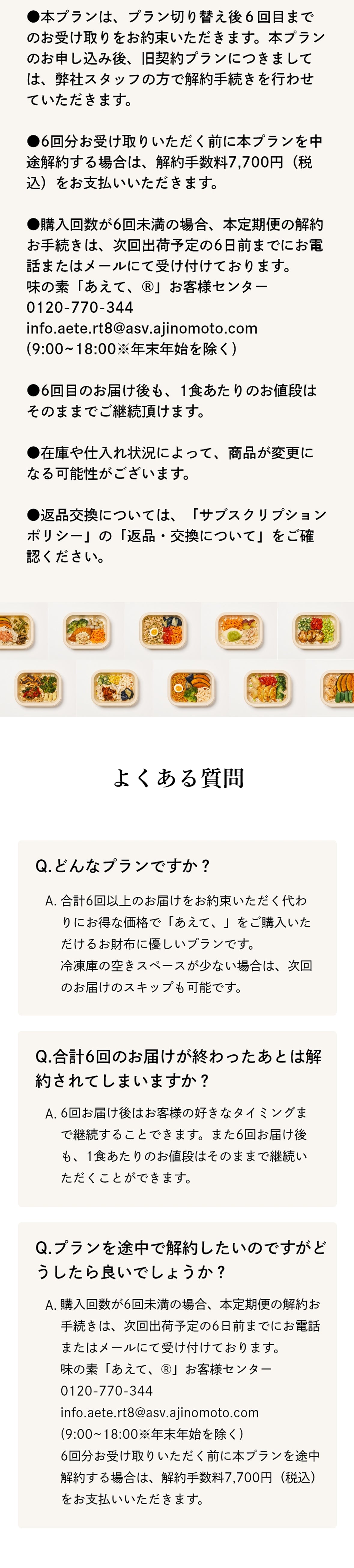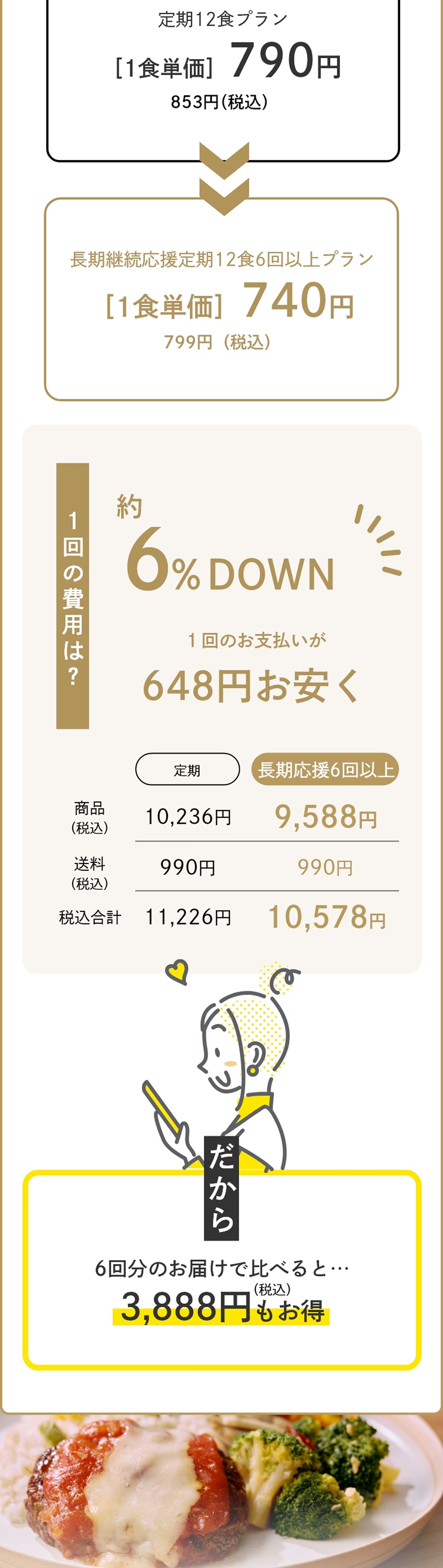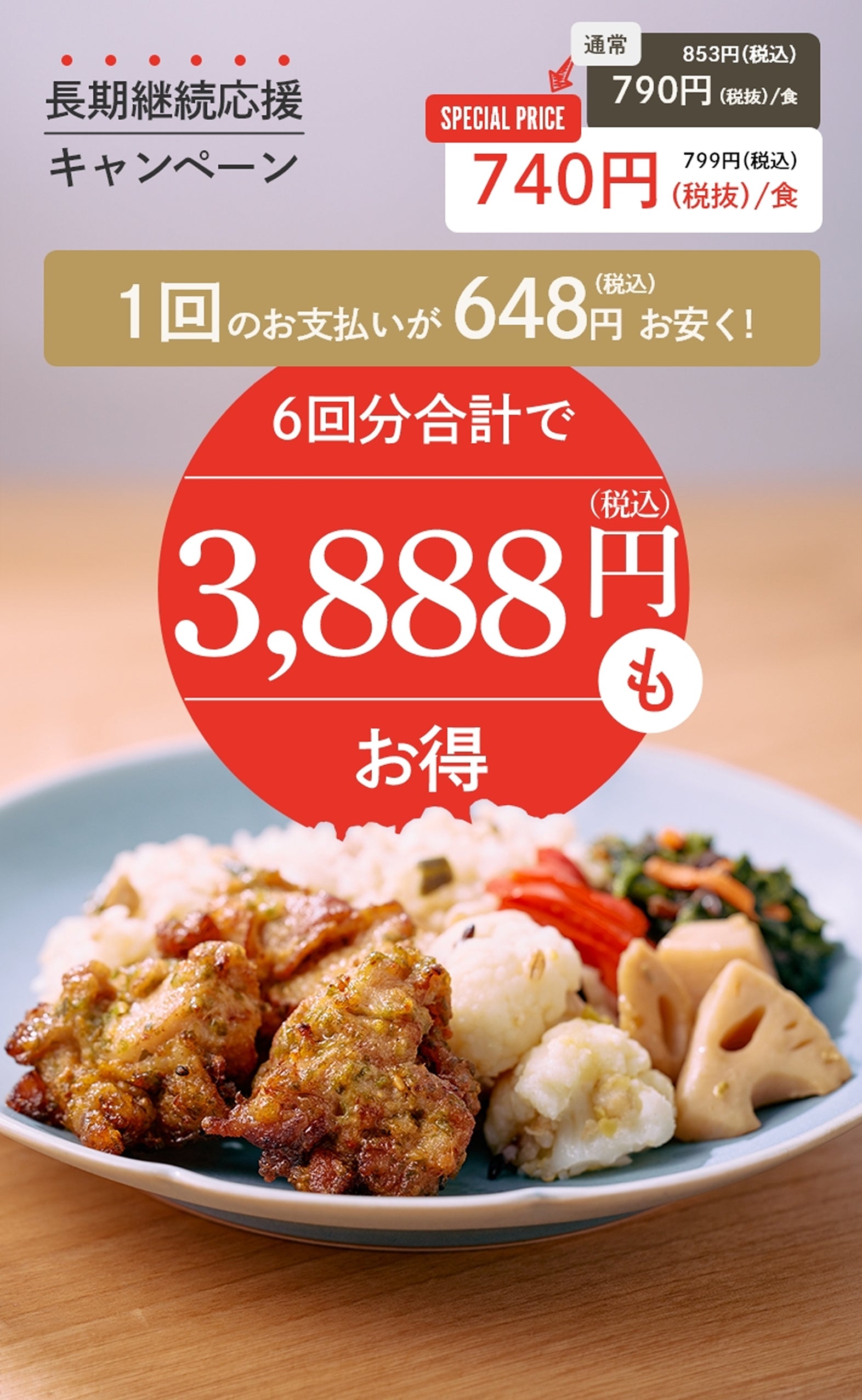 ●6回目のお届け後はお客様から解約のご連絡をいただくまで自動継続いたします。なお、6回目のお届け後も、1食あたりのお値段はそのままで継続いただくことができます。
