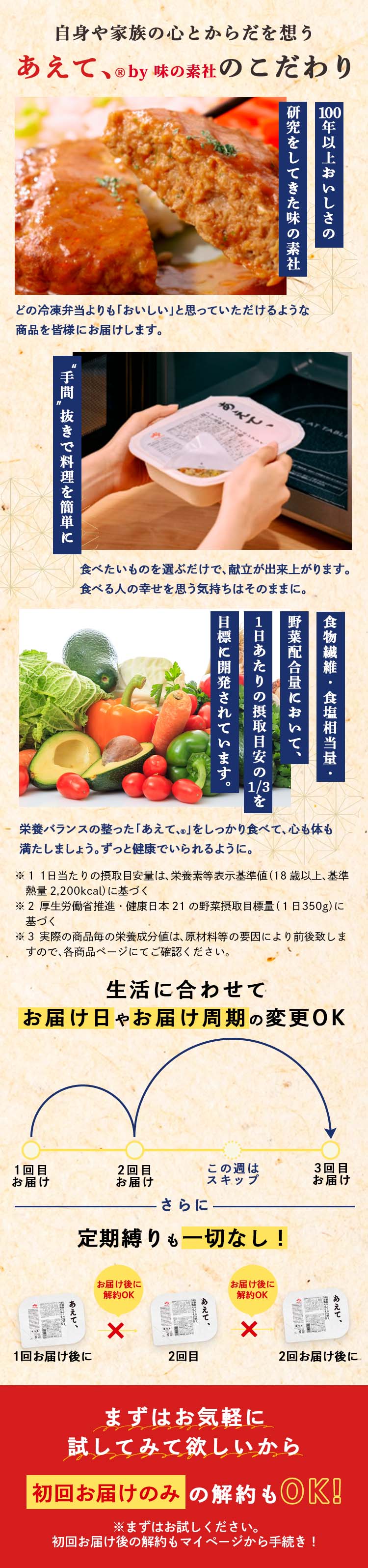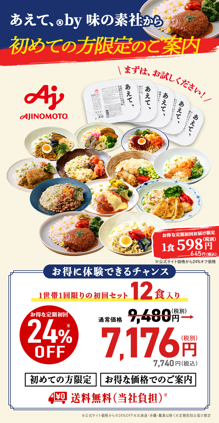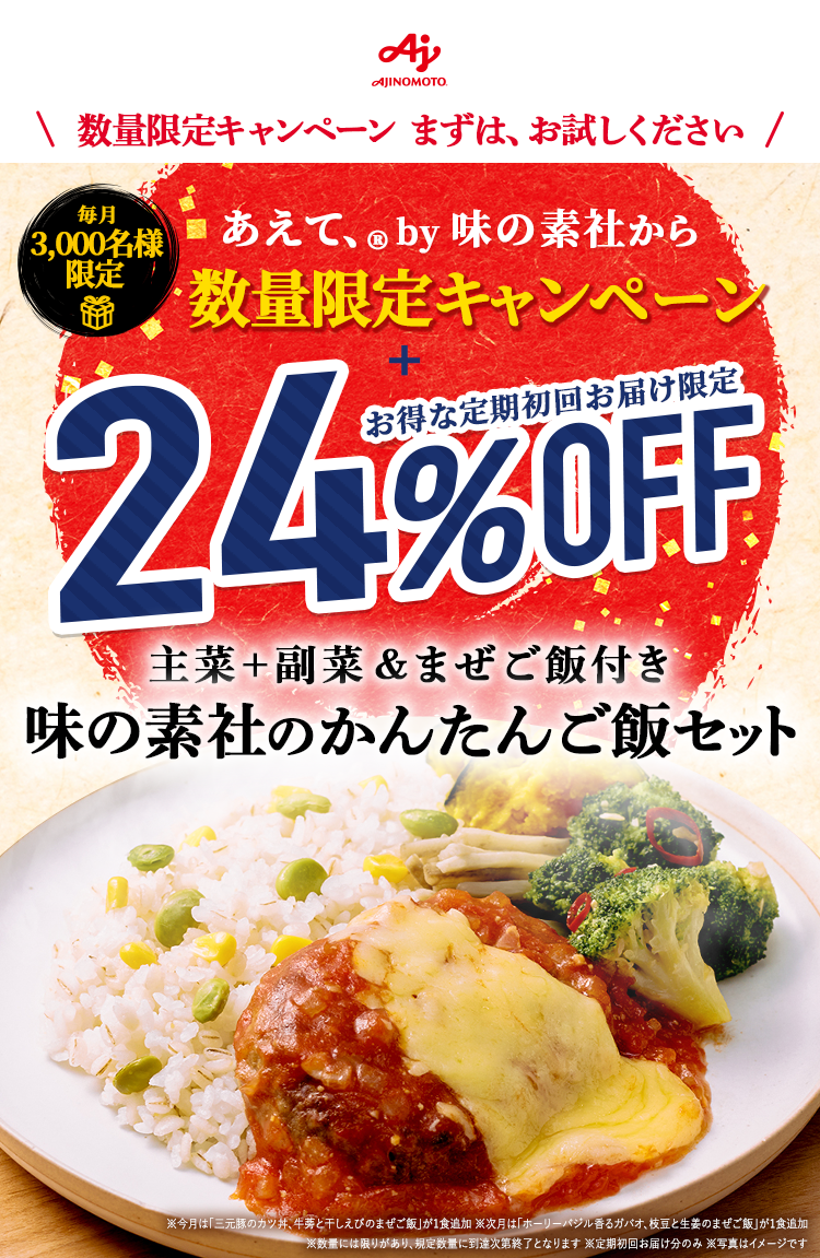 ●定期便の配送ペースの変更・スキップ・解約の際は、次回出荷予定日の6日前までにマイページもしくはお電話でお手続きください。味の素社「あえて、®」お客様相談室 0120ー770ー344(9:00ー18:00※土日祝・年末年始を除く)