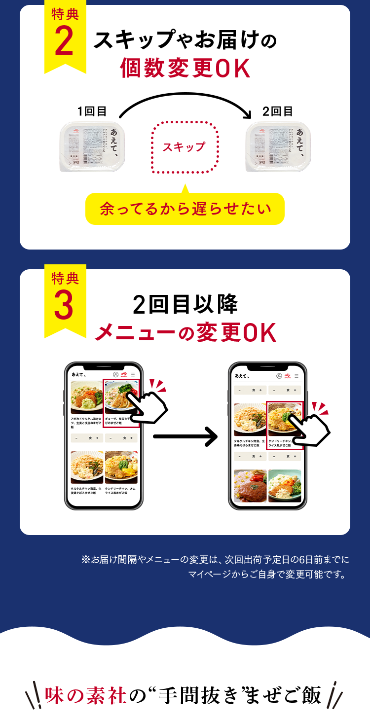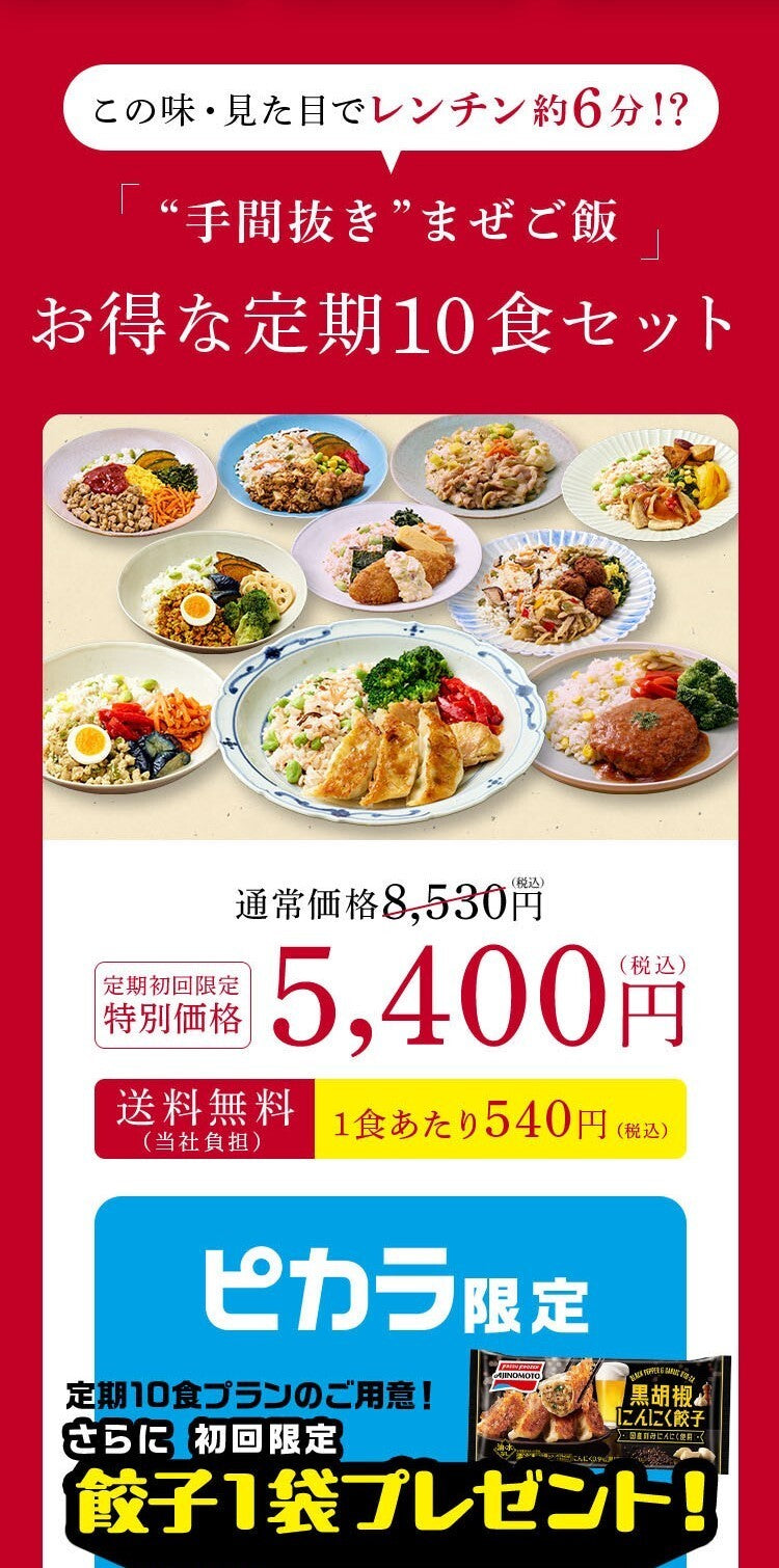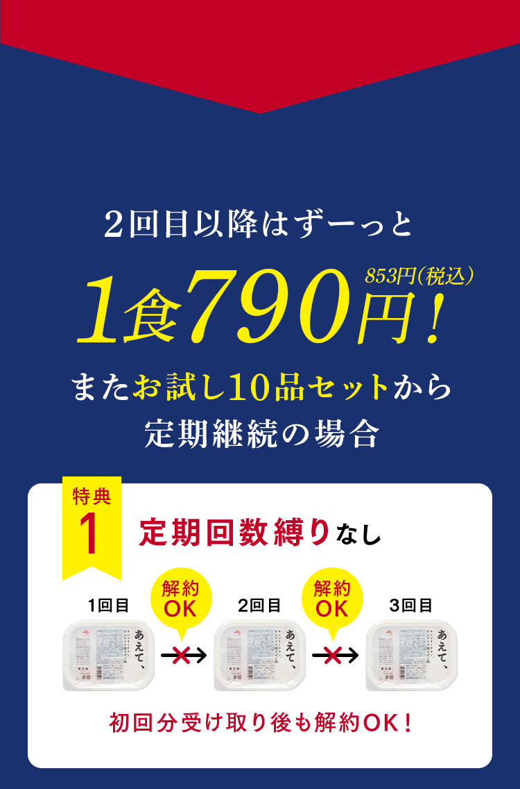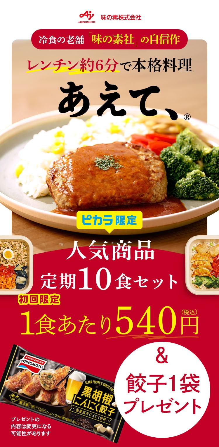 ● 本商品は、お客様から解約のお申し出がない限り、ご契約の間隔で期限の定めなく自動で継続してお届けする定期便です。●定期お届けサービスの各回のお支払合計:「10食コース:1回目5,400円(税込)、2回目以降8,530円(税込)+送料…」※送料はお届け地域によって異なります。 ●初回お届けのみ送料無料(味の素社負担)、2回目お届け以降は、送料は990円(税込)を頂戴いたします。 ※沖縄・北海道・一部離島地域は初回お届けから2,500円(税込)を頂戴いたします。●初回配達日は注文時にご指定いただいた配送希望日、2回目以降は1回目の配送日から選択いただいた定期プランのお届け間隔(1週間、2週間、3週間、4週間)ごとにお届けします。詳細はマイページにてご確認ください。 ※一部キャンペーン・特別プランの条件によって異なる場合がございます。 ※発送はクロネコヤマトのクール便(冷凍)でお届けします。商品の特性上、宅配ボックスなどでの受け取りはできません。一部配送ができない地域がございます。●お客様から解約のお手続きを頂くまで契約を毎回自動更新し、お届けを継続いたします。 ●支払時期、支払方法、配送時期、返品交換については、「サブスクリプションポリシー」および「特定商取引法に基づく表記」をご確認ください。●定期便の配送ペースの変更・スキップ・解約の際は、次回出荷予定日の6日前までにマイページもしくはお電話でお手続きください。味の素社「あえて、®」お客様相談室 0120ー770ー344(9:00ー18:00※土日祝・年末年始を除く) ●在庫や仕入れ状況によって、商品が変更になる可能性がございます。