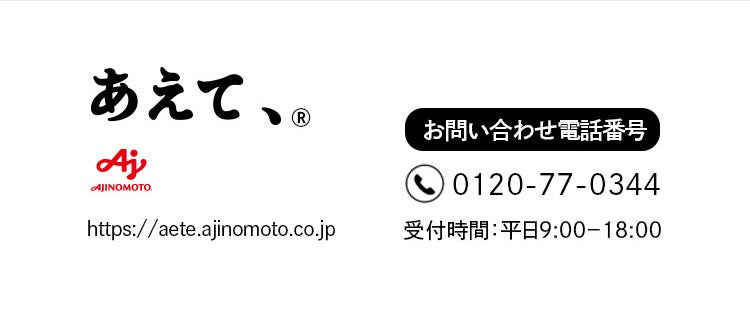 味の素社の「あえて、®」の賞味期間は製造から1年です。全ての商品には「賞味期限」の表記がございますのでご確認ください。賞味期限・賞味期間に関わらずできるだけお早めにお召し上がりください。